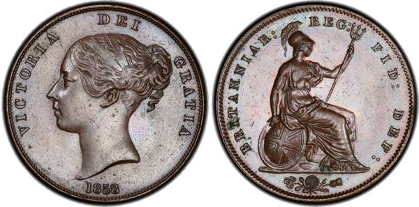 Victoria (1837-1901), copper Penny, 1858, LARGE ROSE variety, ornamental trident, young fi lleted head left, W.W. incuse on truncation for engraver William Wyon, date below, legend surrounding VICTORIA DEI GRATIA. Rev, Britannia seated right with ornamental trident and shield legend reads BRITANNIAR REG FID DEF, emblems in exergue (S.3948 var; BMC ). Choice uncirculated toned. Encapsulated by PCGS as 1858 MS64 BN. Photo by PCGS.