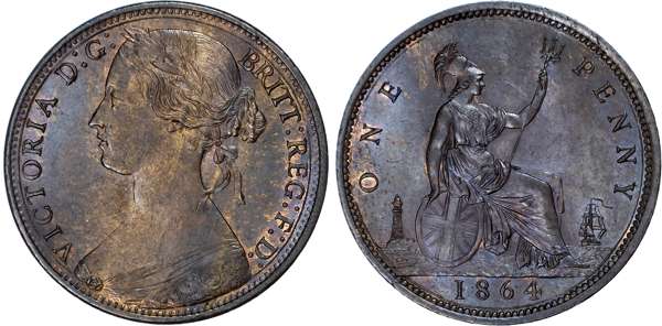 Victoria (1837-1901), Penny, 1864, Crosslet 4 variety, toothed border, young head left, reverse Britannia seated, with shield and trident, (F48 dies 6+G; Peck 1663; Gouby B; Satin 52; S3954). About uncirculated with a trace of lustre on both sides. Extremely rare.