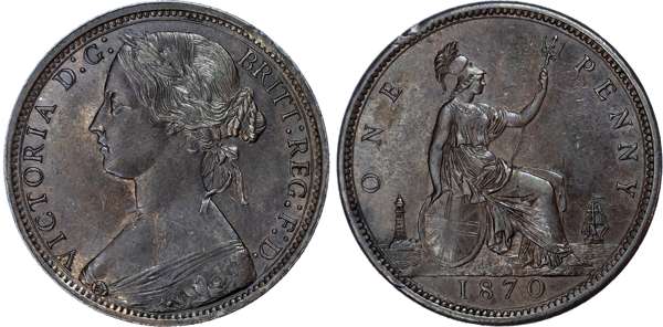 Victoria (1837-1901), Penny, 1870, toothed border, young head left, reverse Britannia seated, with shield and trident, (F60 dies 6+G; BMC 1686; Gouby Ac; S3954). About uncirculated, a tiny hint of lustre on the obverse. Minute flaw on edge.