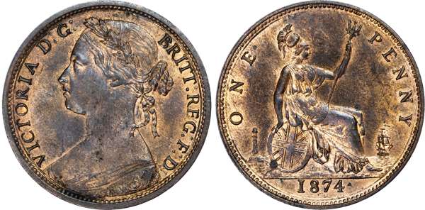 Victoria (1837-1901), Penny, 1874, toothed border, young head left, reverse Britannia seated, with shield and trident, (F72 dies 7+H; BMC 1693; Gouby D; S3954). About uncirculated with pleasing lustre on both sides.