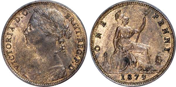 Victoria (1837-1901), Penny, 1879, toothed border, young head left, reverse Britannia seated, with shield and trident, (F97 dies 9+J; BMC 1715; Gouby B; S3954). Good extremely fi ne, some lustre on both sides.
