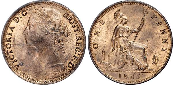 Victoria (1837-1901), Penny, 1881, toothed border, young head left, reverse Britannia seated, with shield and trident, (F102 dies 9+J; BMC 1720; Gouby A; S3954). Uncirculated with nearly lustre on both sides, one or light surface marks.