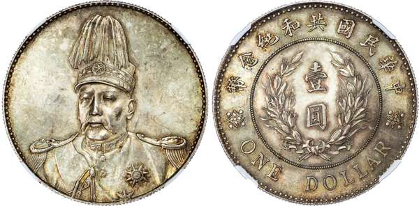 China, Republic, Yuan Shih-Kai "Plumed Hat" silver Dollar, no date (1914), Central Mint Tientsin, Commemorative for the Founding of the Republic of China; facing bust of Yuan Shih-Kai in military att ire. Rev. Value within wreath (KM Y-322; LM 858; K. 642). In NGC holder graded MS 62 (6134656-001). Beautiful golden tone.