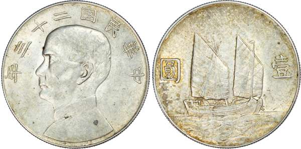 China, Republic, Sun Yat-Sen, silver Junk Dollar, year 23