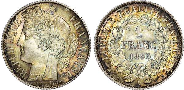 France, Third Republic, silver Franc, 1895, Paris mint, 5.00g (Gad. 465a; KM 822.1). Uncirculated, lovely rainbow tone.