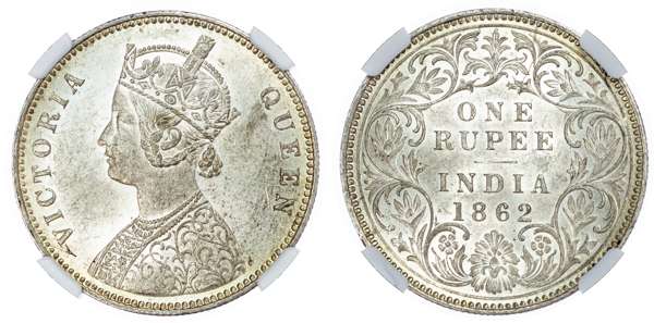 India, EIC, Victoria (1837-1901), silver Rupee, 1862, Calcutta (KM 473.1). In NGC holder graded MS 62 (6768928-006).