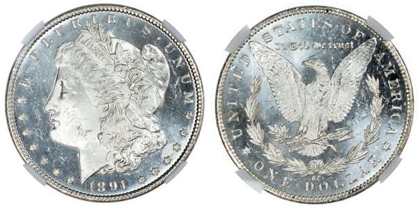 USA, silver Morgan Dollar, 1891, Carson City, 26.81g (KM 110). In NGC holder graded MS 63 (6134657-002). Proof-like appearance. Photo by NGC.