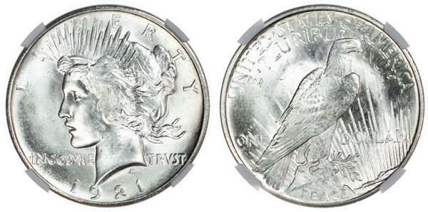 USA, High Relief silver Peace Dollar, 1921, Philadelphia, 26.79g (KM 150). First year for Peace Dollar with a high relief. In NGC holder graded MS 64 (6134657-007). Photo by NGC.