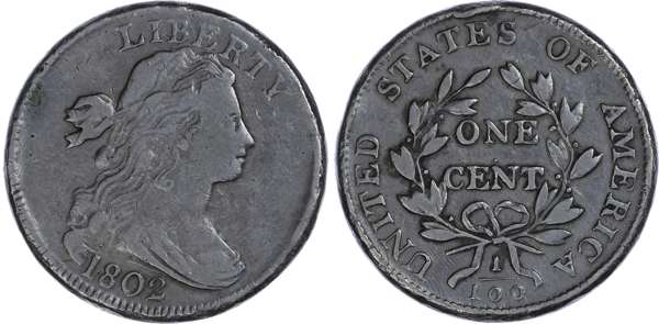 USA, copper Draped Bust Cent, 1802, Philadelphia mint, engraver: Robert Scot, 11.12g (KM 22). Good Fine to About Very Fine.
