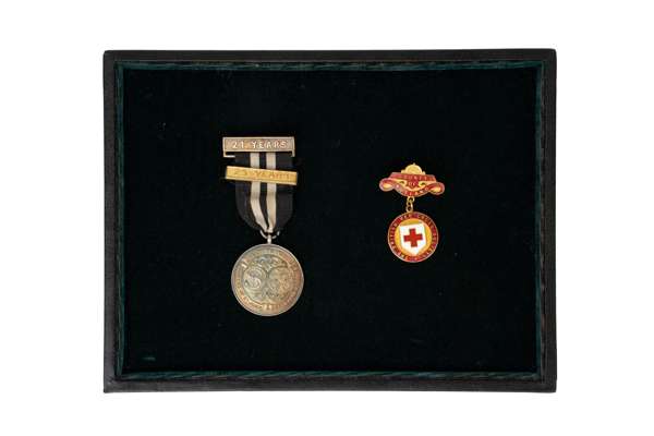 St John Ambulance Southern Railway Long Service Medal with 21 and 25 Year Bars, (William J Clarke 1949, British Red Cross Society Badge for the County of Rutland, unnamed, toned, fine (2)