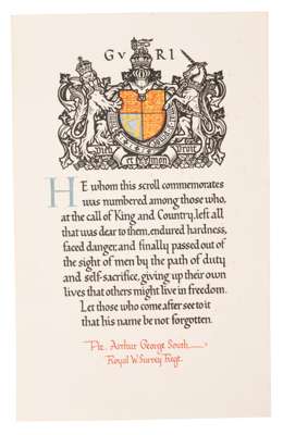 The Great War Memorial Scroll awarded to Private Arthur George South, 6th Battalion The Queen’s (Royal West Surrey Regiment), who had been gassed and previously wounded before he was Killed in Action on the 1st of July 1918. Comprising Memorial Scroll, (Pte. Arthur George South Royal W. Surrey Regt.), very fine. (1)