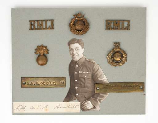 Royal Marine Light Infantry, Shoulder Titles And Cap Badges Cpl A E S Howlett HMS Glory Battle and present at the Battle of Jutland. Two Metal Name Plates 2 Original Photographs, very fine (lot)