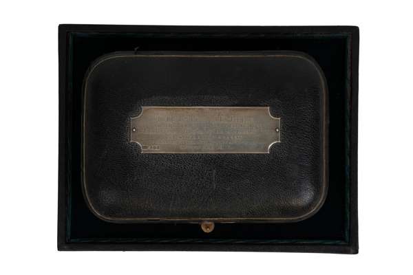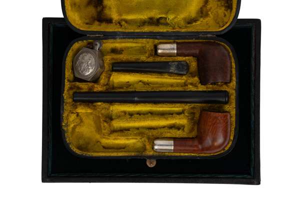 A Pipe Presentation Case With Two Pipes and Lighter Made from a General Service Button (Presented to CQMS J E Jilks 14th Reserve Battalion CEF Shorncliffe October 1916) Hallmarks for Chester 1914, as found (Lot)