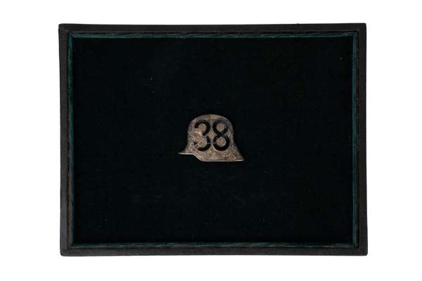 Hungarian Infantry Badge circa 1930, 38th Infantry. This badge is often referred to as the assault badge. The helmet shaped insignia of the 38th Regiment shows a corn grenade. This badge is one of the most recognised Hungarian infantry badges and can be seen on the cover of the 38th Regiment History published in the 1930’s. This is a silver plated version with the correct black fire enamel numbers.