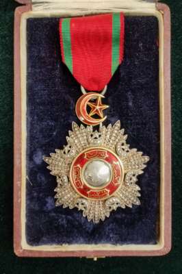 Ottoman Empire, Order of the Medjidieh, Fifth Class breast badge, 68mm including Star and Crescent suspension x 54mm, silver, gold appliqué, and enamel, with original narrow riband, in original embossed fitted case of issue, good very fine (1)
