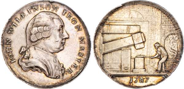 West Midlands, John Wilkinson silver trial (?) Halfpenny 1787, Bust of Wilkinson right, rev. man at a drop hammer, plus brickwork and window visible in forge, edge WILLEY SNEDSHILL BERSHAM BRADLEY, 32mm/16.89gm. (DH 359var), very large flan – flan expanded. Small dig on cheek, otherwise good Extremely Fine with pretty golden iridescence to toning, Of the highest rarity – Unique.