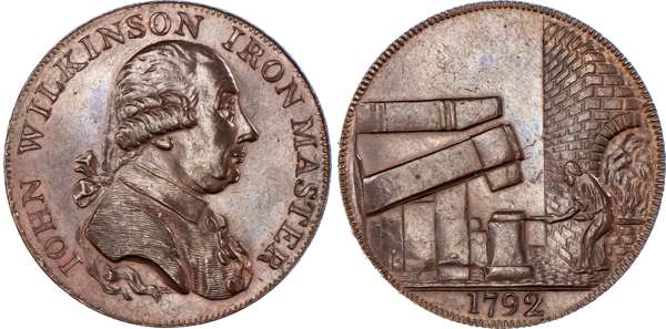 West Midlands, John Wilkinson bronzed proof Halfpenny 1792, bust of Wilkinson right, rev. man at a drop hammer, no brickwork behind hammer, edge WILLEY SNEDSHILL BERSHAM BRADLEY, 29mm/10.55gm. (DH 389). Good Extremely Fine, proof‑like bronze, Rare.