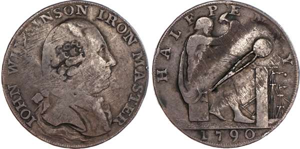 West Midlands, John Wilkinson Contemporary Forgery of a Halfpenny 1790, bust of Wilkinson right, rev. Vulcan seated right, edge WILLEY SNEDSHILL BERSHAM BRADLEY, , countermarked with a pair of dividers (?) on rev., 30.25mm/9.40gm. (cf DH 426), host coin Fine and toned. Unique.