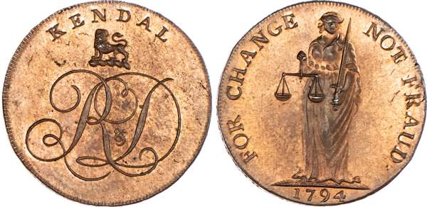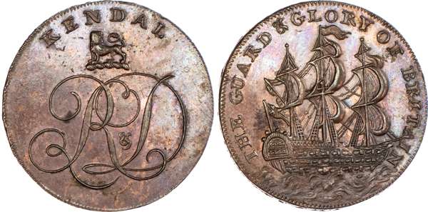 Kendal, Lutwyche mule Halfpenny 1794, Lion crest over R&D cypher, rev. justice standing holding sword and scales (as Suffk. DH 22), edge PAYABLE AT BANBURY OXFORD OR READING +, 30mm/11.32gm. (DH 4). Another mule but man of war rev. (as Hants. DH 29), edge PAYABLE IN DUBLIN OR LONDON, 29.5mm/9.42gm. (DH 5a), Both good Extremely Fine, first with almost full mint lustre, second toned with iridescence. [2]