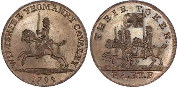 County, Markes Lambe, Lutwyche's Halfpenny, Mounted Dragoon galloping left, WILTSHIRE YEOMANRY CAVALRY around, rev. three mounted dragoons left, one carrying the Union flag, edge diagonally milled, 30mm/9.37gm. (DH 1), good Extremely Fine, toned with even underlying brilliance. Rare.
