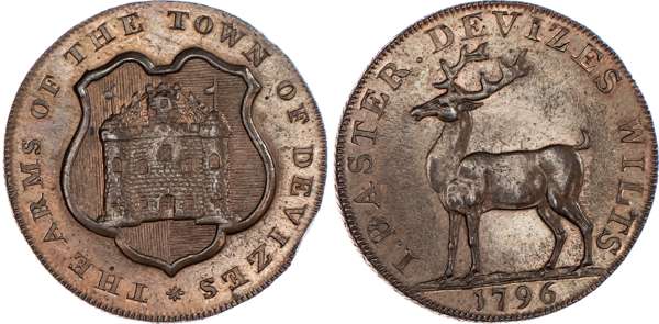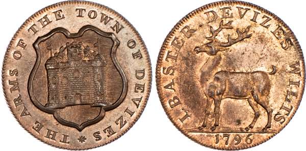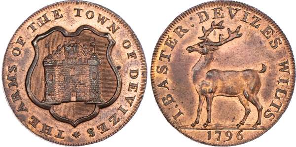 Devizes, Joseph Baster (breeches and glove maker) halfpenny 1796, Arms of Devizes, rev. Stag standing