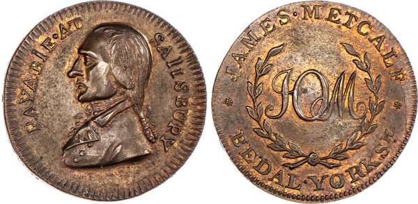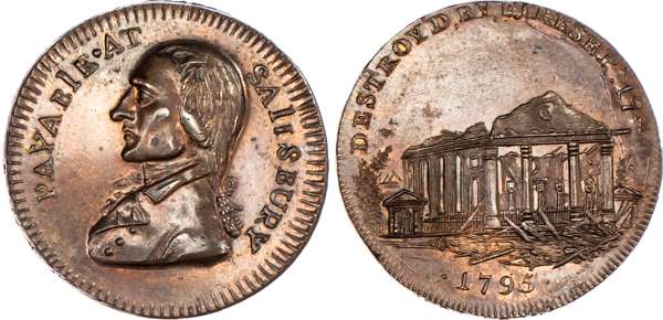 Salisbury, Skidmore’s mule Halfpenny 1795, Draped bust left, rev. Ruins of burnt-out St. Paul’s Covent Garden, edge SKIDMORE HOLBORN LONDON, 29mm/13.10gm. (DH 13). Another mule but rev. IOM cypher in laurel wreath, 29.5mm/12.97gm. (DH 14), both good Extremely Fine, first with much original colour and reflectivity, second not quite so reflective, both rare. [2]