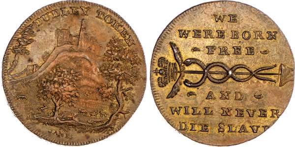 Dudley, Spence’s mule Halfpenny 1790, Distant view of Dudley Castle, rev. caduceus between six-line legend, edge SPENCE DEALER IN COINS LONDON, 28.25mm/12.24gm. (DH 11). Another the same but in brass, 28.75mm/13.00gm. (DH 11), first good Extremely Fine, toned with some iridescence, second about Extremely Fine with yellow toning. First rare, second off metal piece Extremely Rare ‘RRR’. [2]