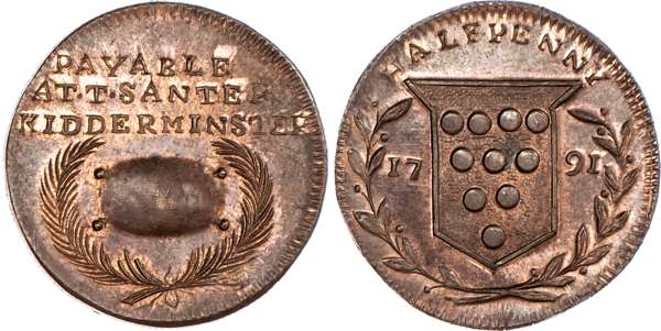 Kidderminster, T Santer, Skidmore’s Halfpenny 1791, three-line legend over woolsack, rev. Arms