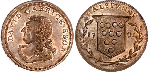 - Kidderminster ? edge plain, 31mm/11.05gm. (DH 23). A mule of last - with bust of David Garrick
