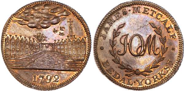 Bedale, James Metcalf, Skidmore's Halfpenny 1792, View of a terraced street, church behind, rev. JOM cypher in wreath, edge diagonally milled, 30.5mm/10.89gm. (DH 9), good Extremely Fine, much original colour, some iridescence, very rare ‘RR’.