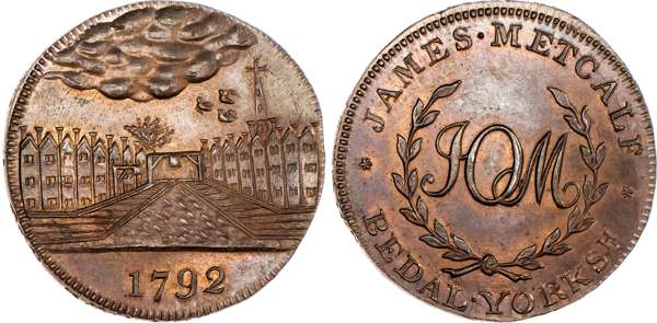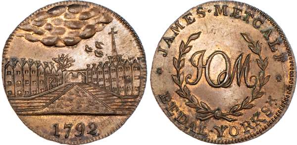 Bedale, James Metcalf, Skidmore's Halfpenny 1792, Another from the same dies but edge SKIDMORE HOLBORN LONDON, 29.5mm/12.85gm. (DH 9a). Another from the same dies but edge engrailed, 29.5mm/9.36gm. (DH 9b), both good Extremely Fine with some original lustre, second with good brilliance and iridescence and an extremely rare variety ‘RRR’. [2]
