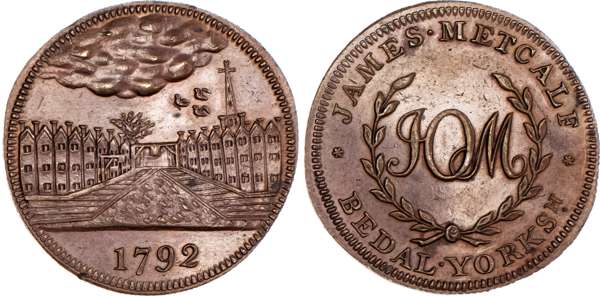 Bedale, James Metcalf, Skidmore's Halfpenny 1792, Another from the same dies but edge plain, 31.25mm/10.63gm. (DH 9c). Another from the same dies but bronzed, 31.1mm/9.95gm. (DH 9c), both good Extremely Fine, first with some original lustre and much iridescence, second with good subdued bronze lustre and an extremely rare variety ‘RRR’. [2]