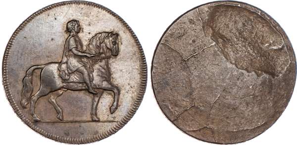 Equestrian statue of William III, with no legend but details completed, rev blank, edge PAYABLE AT