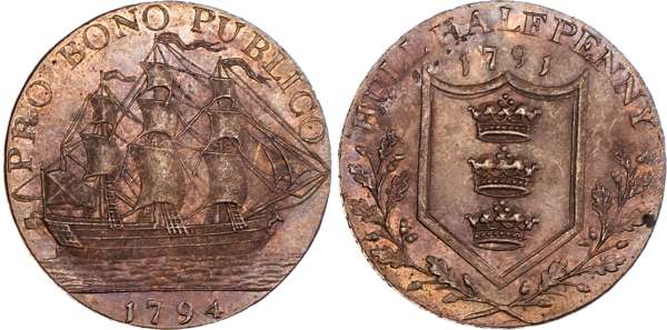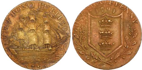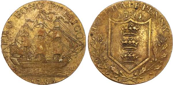 Hull, Jonathan Garton brass Halfpenny 1791 merchant ship in full sail right, rev. Arms of Hull in an oaken wreath, edge PAYABLE AT THE WAREHOUSE OF JONATHAN GARTON & Co .x., 28.5mm/1.31gm. (DH 22). Another similar, copper and legend PRO BONO PUBLICO now added to rev. edge, CURRENT EVERYWHERE, 28.25mm/9.63gm. (DH 23) Another the same but in brass, 28.75mm/9.29gm. (DH 23). Another the same but edge PYABLE IN LONDON BRISTOL & LANCASTER, 28.5mm/9.94gm. (DH 23a). Another the same but in brass, 28.5mm/10.17gm. (DH23a). Another but a mule – St. Andrew obv., 29mm/9.87gm. (DH 25), copper pieces generally Extremely Fine or better with traces of lustre, brass pieces generally good Very Fine or better, yellow toned – all these off‑metal pieces extremely rare ‘RRR’. [6]