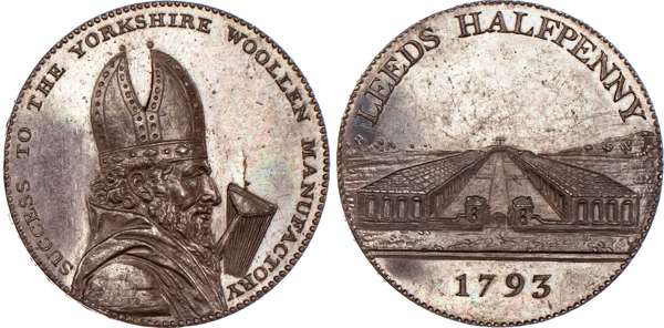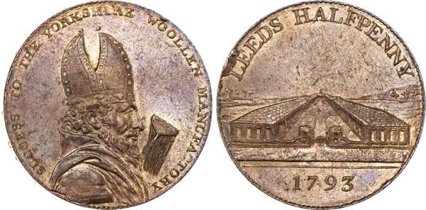 Leeds, Henry Brownbill (silversmith, watchmaker) bronzed proof Halfpenny 1793, Bust of Bishop Blaze with woolcomb, rev. View of Coloured Cloth Hall buildings, edge PAYABLE. AT. H. BROWNBILL’S. SILVERSMITH., 29mm/11.69gm. (DH 34). Another but ordinary issue and rev. legend differently spaced29mm/11.89gm. (DH 37), Both good Extremely Fine, first bronzed with proof‑like reflective surfaces, second with small rev. edge break, toned with a hint of lustre, [2] First ex F S Cokayne Col., his ticket. Acquired AHB c. 1946.