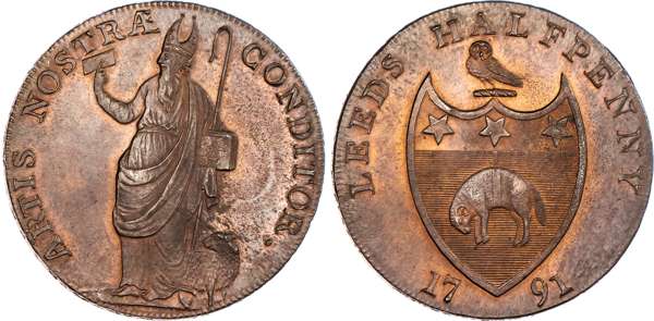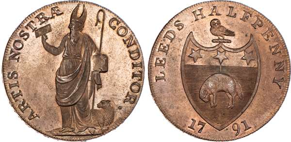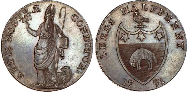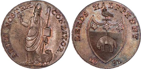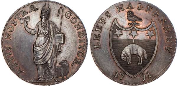 Leeds, Richard Paley (soap-boiler, chandler) Halfpenny 1791, Bishop Blaze holding woolcombe, standing left, a sheep below, rev. Arms of city of Leeds, edge PAYABLE AT THE WAREHOUSE OF RICHARD PALEY, 29.75mm/12.65mm. (DH 44). Another similar but woolcombe in slightly diff. position, 29.5mm/12.64gm. (DH 45). Another similar but position of woolcombe slightly different, 30mm/12.96gm. (DH 46). Another similar but again, woolcombe in slightly different position, 30mm/12.51gm. (DH 47). Another similar but obv. period closer to legend, 30mm/12.55gm. (DH 48), all generally good Extremely Fine, all with a fair amount of original colour apart from DH 46 which is toned. [5]