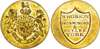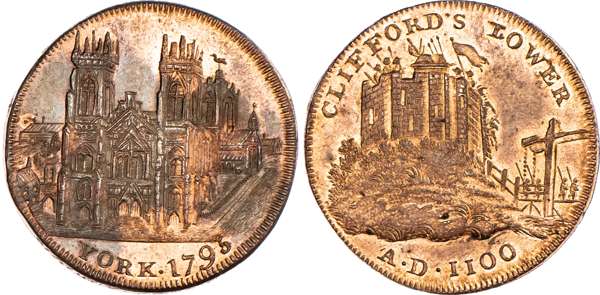 York, Uncertain issuer, Halfpenny 1795, View of York cathedral, rev. View of Clifford’s tower, edge YORK BUILT A.M. 1223 CATHEDRAL REBUILT AD. 1075, 29mm/11.07gm. (DH 63). York, Benjamin Hobson (ironmonger & cutler) advertising gilt halfpenny undated, Royal Arms rev. shield with 5-line advertisement, edge plain, 28mm/5.16gm., first good Extremely Fine, with full blazing lustre on rev. but toned area on obv., Second lustrous gilding just toning a little on salient areas, superb and rare. [2]