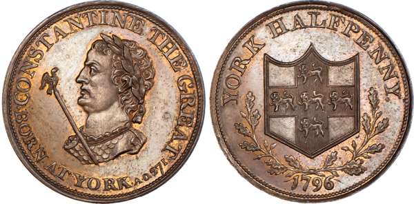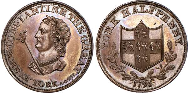 York, James Carlill (watchmaker) Halfpenny 1796, bust of Constantine the Great left holding sceptre, rev. Arms of York in oaken wreath, edge PAYABLE AT YORK, 29mm/11.70gm (DH 69). Another the same but bronzed proof, 29mm/11.79gm. (DH 69), both good Extremely Fine, first with some original colour, second toned and proof-like with much iridescence, both rare. [2]