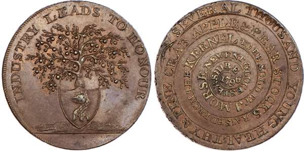Newent, John Morse, (Nurseryman) Halfpenny 1796, Morse (?) arms at base of an apple tree, rev. Spiral legend with date in middle, edge PAYABLE IN NEWENT, rest engrailed, 29mm/12.19gm. (DH 64). Another but in the legend, THOUSANDS no longer has an S at the end, 29mm/10.40gm. (DH 65), both good Extremely Fine and toned with remnants of original lustre, second scarce. [2]