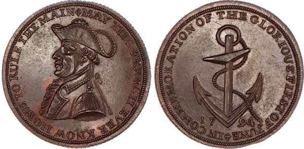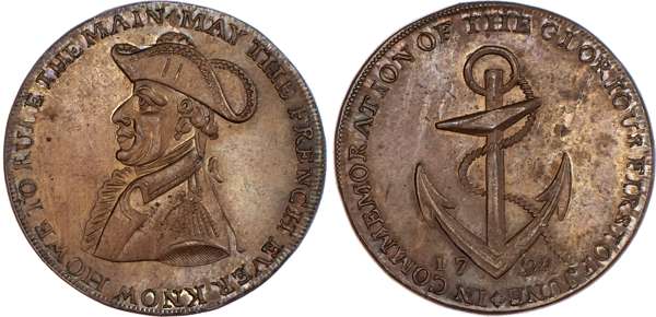 Emsworth, Skidmore’s Halfpenny 1794, Robust style bust of Admiral Earl Howe, rev. cable and anchor, edge diagonally milled, 30mm/9.86gm. (DH 35). Another but plain edge and on a smaller flan, 27.5mm/8.14gm. (DH 35a), both good Extremely Fine, first bronzed and well struck up, second lightly toned with trace of lustre, both rare. [2]