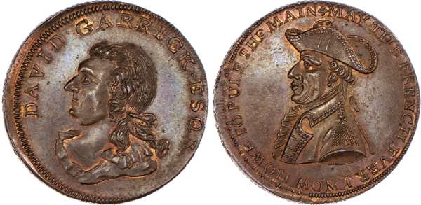 Emsworth, Skidmore’s Mule Halfpenny, Robust style bust of Admiral Earl Howe, rev. bust left of David Garrick, edge SKIDMORE HOLBORNE LONDON, 28.5mm/12.07gm. (DH 36). Another but edge diagonally milled over previous legend, 29mm/11.98gm. (DH36a), both good Extremely Fine, first almost bronzed, second with considerable amounts of original lustre – both very rare ‘RR’. [2]