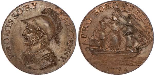 Gosport, J Jordan (draper) Halfpenny 1794, Helmeted bust of Sir Bevois left, rev. sailing ship, edge PAYABLE AT I IORDANS DRAPER GOSPORT, 29.5mm/10.08gm. (DH 41). Lyndhurst, Visit of Geo. III Halfpenny 1789, Bust of Geo. III right, rev. seven-line legend, edge plain, 29.5mm/7.72gm. (DH 45). Both good Extremely Fine, both with more than a trace of lustre, last with two light carbon spots on obv. [2]