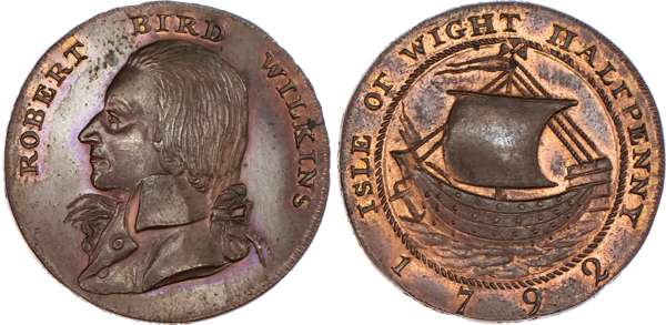 Newport, Isle of Wight, Robert Wilkins (Ironmonger) Halfpenny 1792, bust left of Wilkins, rev. Arms of Newport (ship), edge PAYABLE AT HIS OFFICE NEWPORT, 28mm/10.88gm. (DH 46), good Extremely Fine with a lot of original lustre and brilliance. Scarce in good condition.