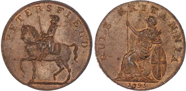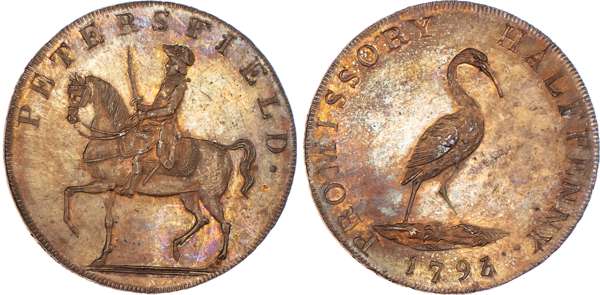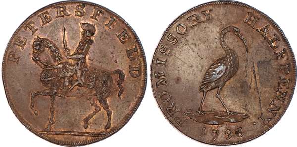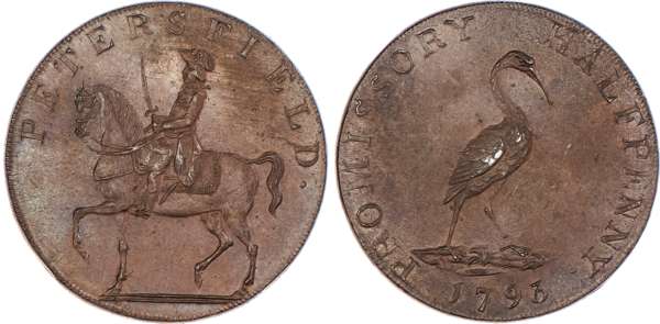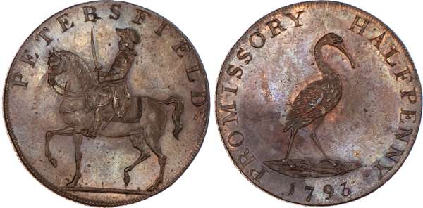 Petersfield, Eames, Holland & Andrews (grocer, meal-man and lawyer [promoting the local yeomanry]) Halfpenny 1793, A mounted dragoon, sword drawn, rev. a stork standing right, edge, EAMES. HOLLAND & ANDREWS PETERSFIELD X-, 29mm/11.33gm. (DH 47). Another but gender of horse visible, 28.5mm/9.19gm. (DH 48). Another the same but edge engrailed, 28mm/10.66gm. (DH 48a). Another the same but edge plain, 28.5mm/9.53gm. (DH 48c). Another the same but edge PAYABLE IN LONDON, rest engrailed, 29mm/9.79gm. (DH 49), all good Extremely Fine, first from rusty dies, all with degrees of original lustre, 48 and 48a with much reflection, 48a and 48c Rare. [5]