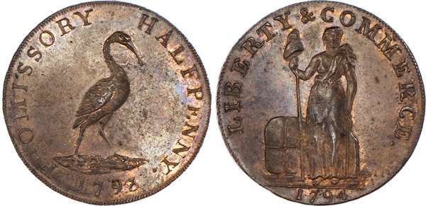 Petersfield, General Circulation Mule Halfpenny 1794, A stork standing right, rev. Talbot, Allum & Lee obv. - Liberty standing with Cap of Liberty on pole, edge PAYABLE IN LONDON, rest engrailed, 28.5mm/9.50gm. (DH 52a), good Extremely Fine, small amount of original colour – Very Rare, muled with a New York trader’s token cent obv.