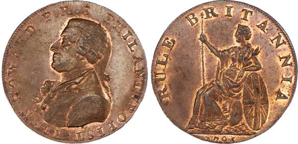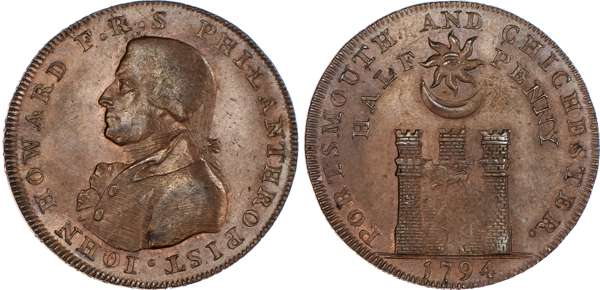 Portsmouth and Chichester and, T Sharp (Mercer) & T Chaldecott (Silversmith) Halfpenny 1794. Bust left of the philanthropist John Howard, rev. Combined arms of the two towns, edge PAYABLE AT SHARPS PORTSMOUTH AND CHALDECOTTS CHICHESTER, 29.5mm/9.77gm. (DH 55). Another but rev. Britannia seated left, edge CURRENT EVERYWHERE, 28mm/9.56gm. (DH 57b), Portsmouth, G Robinson (prof. unknown), John Mooney (cornfactor) & Sir John Carter (brewer and Mayor) Halfpenny 1797, Cable & anchor in wreath, rev. town arms, edge BY G ROBINSON G MOONEY AND I CARTER, 28.5mm/9.22gm. (DH 58), all good Extremely Fine, first toned and a little weakly struck, second and third fairly lustrous, last uncommon. [3]