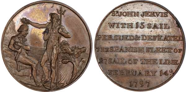 Portsmouth, Thomas Sharp (Mercer) Halfpenny 1797, Sir John Jervis being crowned by Neptune, rev. seven-line legend, edge plain, 29mm/12.07gm. (DH 61), good Extremely Fine, toned with iridesence and proof-like. Rare.