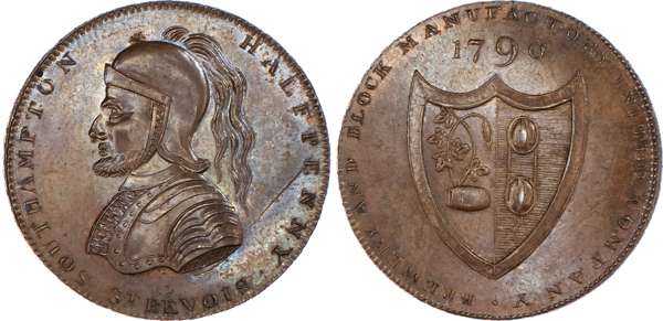 Southampton, Taylor, Moody & Co. Skidmore’s Halfpenny 1790, Another the same but engrailed edge, 29mm/9.32gm. (DH 86b), good Extremely Fine, iridescent toning, superb and Very Rare ‘RR’.