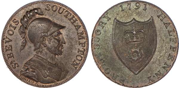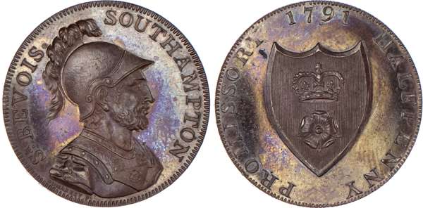 Southampton, Taylor, Moody & Co. Boulton’s Halfpenny 1791, different style armoured bust of Sir. Bevois right, rev. Southampton arms, edge PAYABLE AT THE OFFICE OF W. TAYLOR OR R.V.MOODY & Co., 28mm/11.07gm. (DH 89). Another the same but Bronzed Proof, 28mm/10.39gm. (DH 89), both good Extremely Fine, first toned with traces of original colour, second with beautiful reflective and iridescent toning, superb and rare. [2]