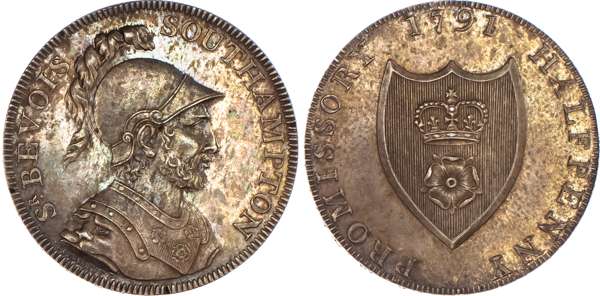Southampton, Taylor, Moody & Co. Boulton’s Halfpenny 1791, Another but Silver Proof, 28mm/12.80gm. (DH 89), four small indentations on denticles on obv. (as seen on other examples), otherwise good Extremely Fine with hazy iridescence and ‘museum’ toning. Rare.